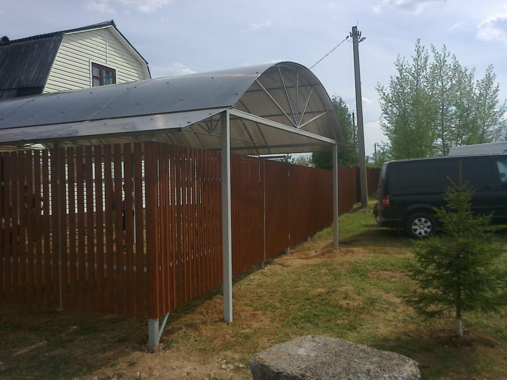 Поэтому компания "НавесСтрой" настоятельно рекомендует не экономить, а усилить каркас навеса для дачи более жёсткими профилями с увеличенной толщиной металла и количеством несущих ферм.