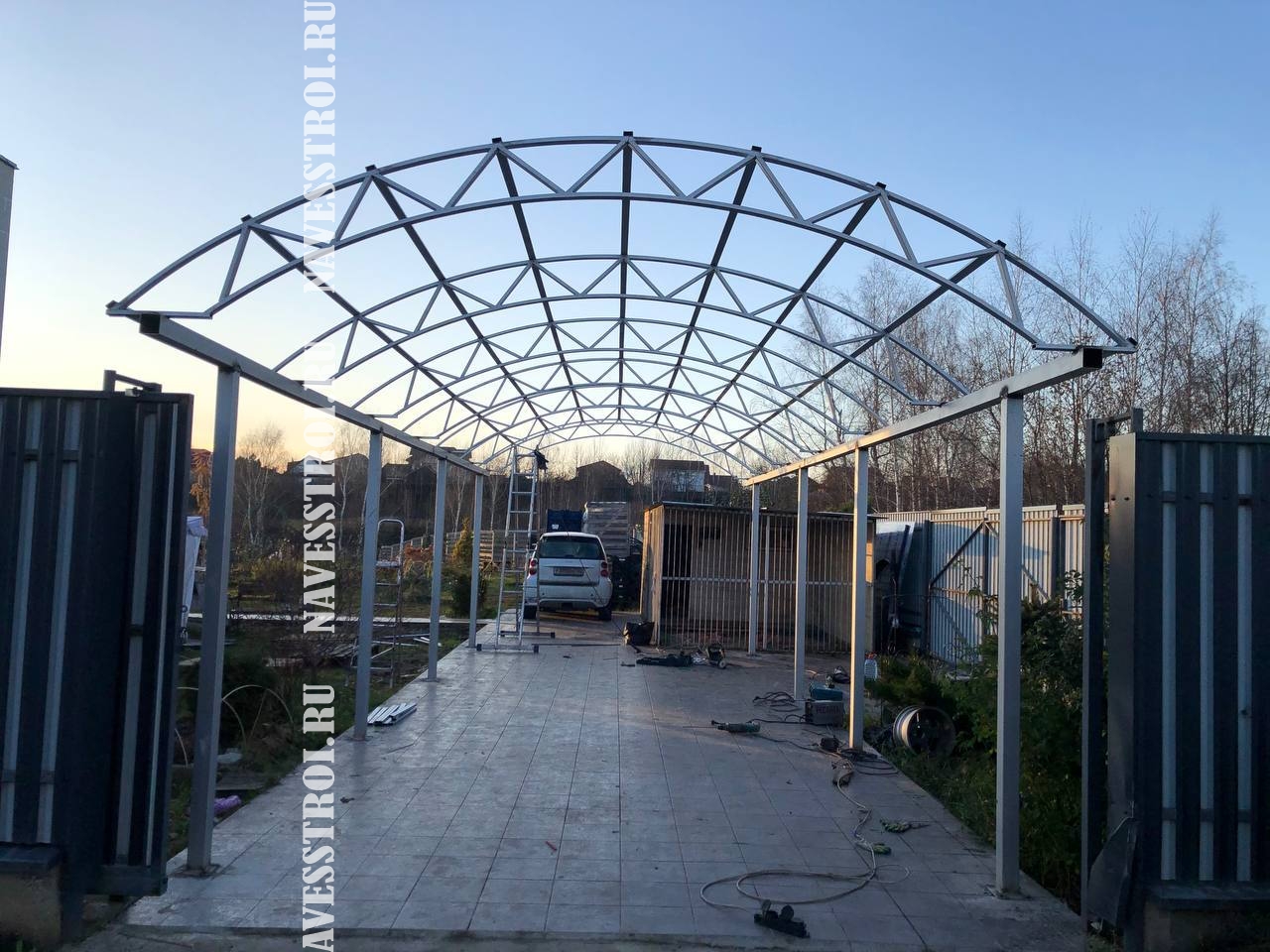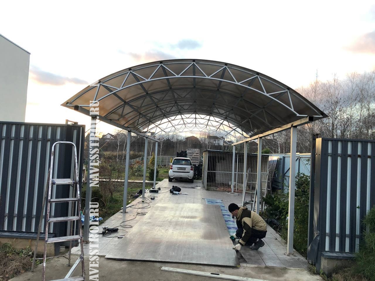 За день на даче изготовили арочный навес 5 на 7 с покрытием поликарбоната. Привезли уже готовые крашенные фермы и весь остальной материал. Все за собой убрали и увезли мусор. Молодцы!
